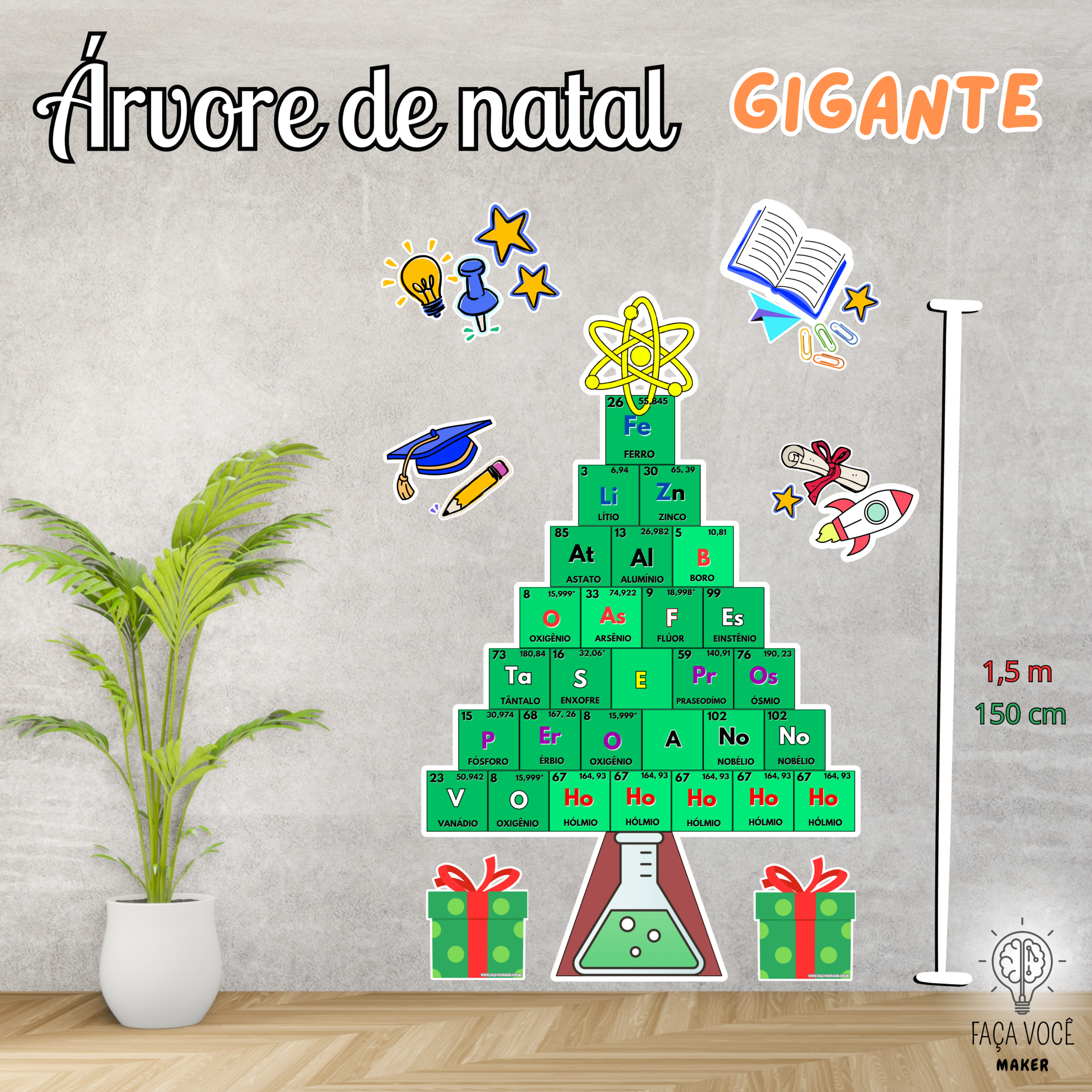 Àrvore de Natal Gigante em formato de tabela periódica contendo cerca de 1,5 metros de altura, ideal para colar na parede.