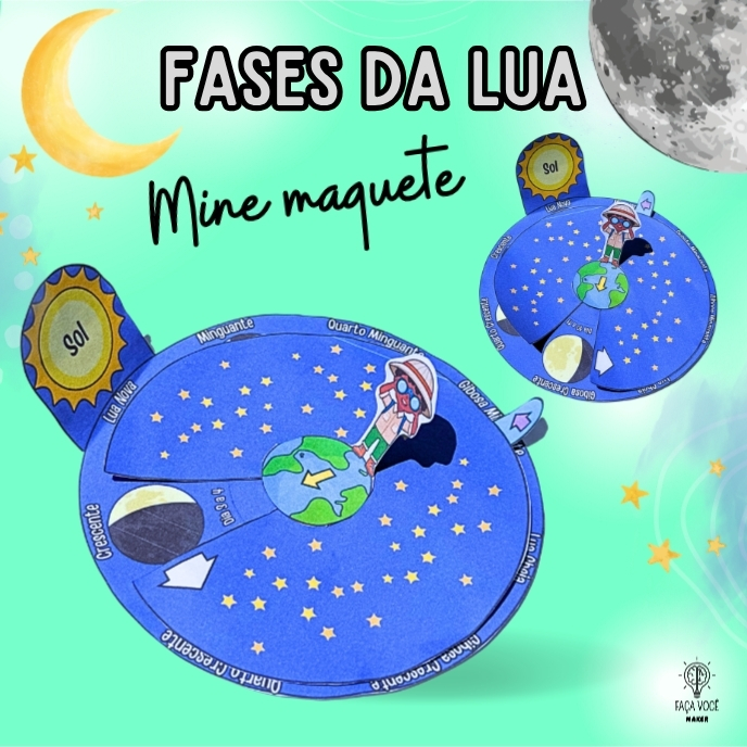 Atividade para evidenciar os movimentos da Lua, identificar suas fases de acordo com o Hemisfério Sul, compreender seu formato esférico e suas principais caracterisiticas, em um modelo didático interativo e de fácil montagem. Com suporte que contém informações sobre o Satélite natural da Terra.
