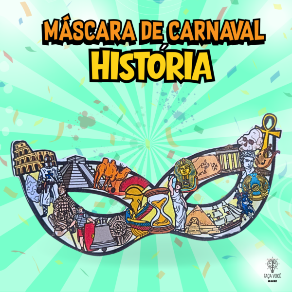Máscara carnavalesca com o tema de História, contendo várias ilustrações para colorir e personalizar