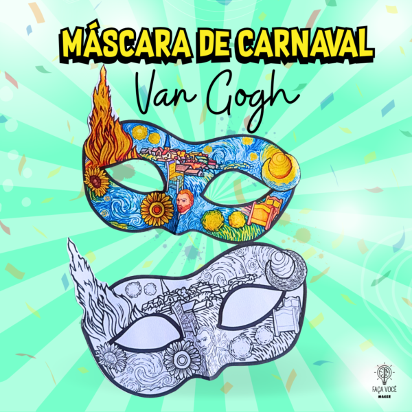 Máscara carnavalesca com o tema Van Gogh, contendo várias ilustrações para colorir e personalizar